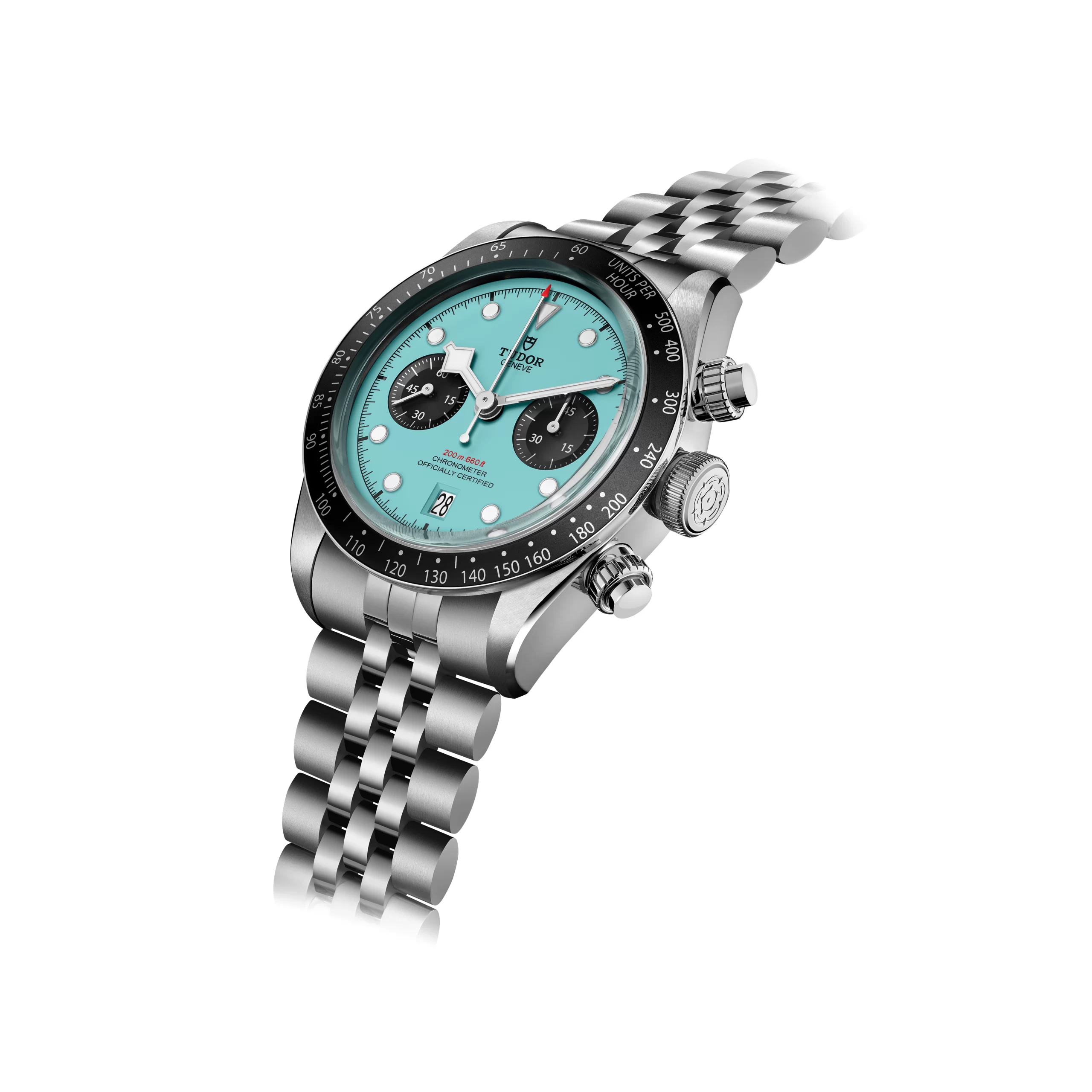 Encased in a 41mm stainless steel case, the Black Bay Chrono “Turquoise” balances a contemporary presence with vintage influences. Its polished and satin-brushed finish offers a refined yet durable look, making it suitable for both casual wear and more formal occasions. The screw-down pushers, reminiscent of classic racing chronographs from the 1960s and 70s, add an extra layer of functionality and water resistance, rated up to 200 meters.