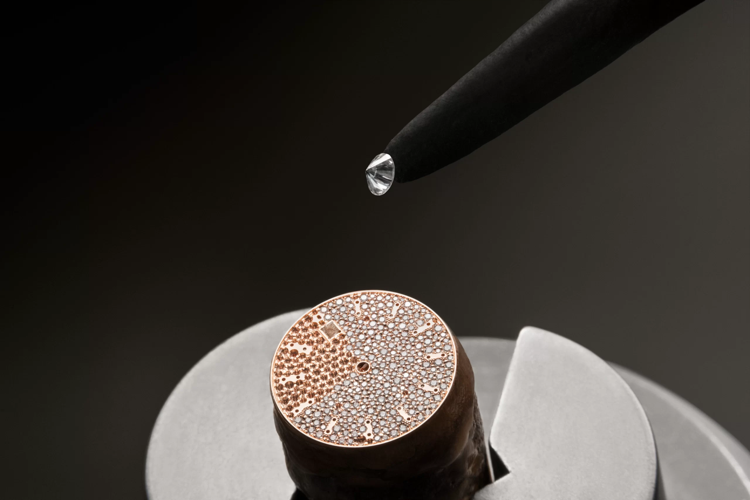 The Maltese cross motif on the bezel – a signature of the Overseas collection, inspired by Vacheron Constantin’s emblem – is highlighted by the radiance of 60 invisibly set baguette-cut diamonds (~ 2.28 cts). Invisible setting is particularly challenging for the gem-setter as it creates a seamlessly gem-covered surface on which the stones appear to float above the gold surface with no visible means of support. First, the gem-setter creates a framework of gold rails, only 0.2 mm to 0.4 mm thick, which forms a secure grid structure that remains hidden once the gemstones are slotted into it. After creating the frame, the artisan must cut a tiny V-shaped groove along both sides of each diamond, to match the position and dimensions of the rails with a tolerance of only 0.02 millimetres, thus ensuring that the stones sit flush, with no gaps, overlaps or visible metal. This setting technique is so meticulous that it can take several hours for just one stone.