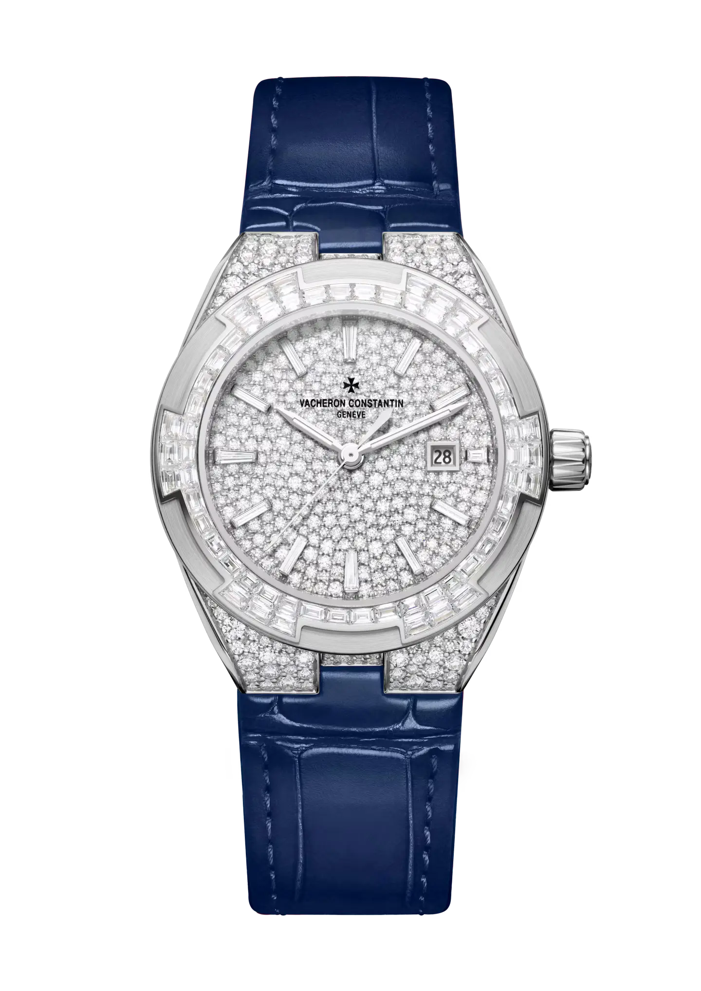 Introduced to the Overseas collection in 2023, the 35 mm diameter case is designed not only to correspond with a modern aesthetic, but also to be suitable for any situation and comfortably worn by everyone regardless of wrist size. Its versatility is underlined by the easy interchangeability of its diamond-set gold bracelet and two straps that are delivered with the watch: one in white rubber and one in shiny alligator leather. Adding a vivid splash of colour to the otherwise monochrome palette of the watch, the white gold model comes with a brilliant blue alligator-skin strap, while the pink gold model is delivered with a fuchsia-coloured alligator-skin strap. Each is secured with an 18K white gold or 18K 5N pink gold pin buckle to match the case metal; set with 62 brilliant-cut diamonds (~0.33 ct), the buckle may also be interchanged to fit another strap of the owner’s choice. As with all Overseas models, the owner needs no tool to easily and quickly change the bracelet, straps or buckle at will. Echoing the Maltese Cross motif found on the bezel the bracelets are outfitted with the easy-fit system inherent to the Overseas collection since 2016, a hidden micro-adjustment that provides the wearer with flawless comfort.