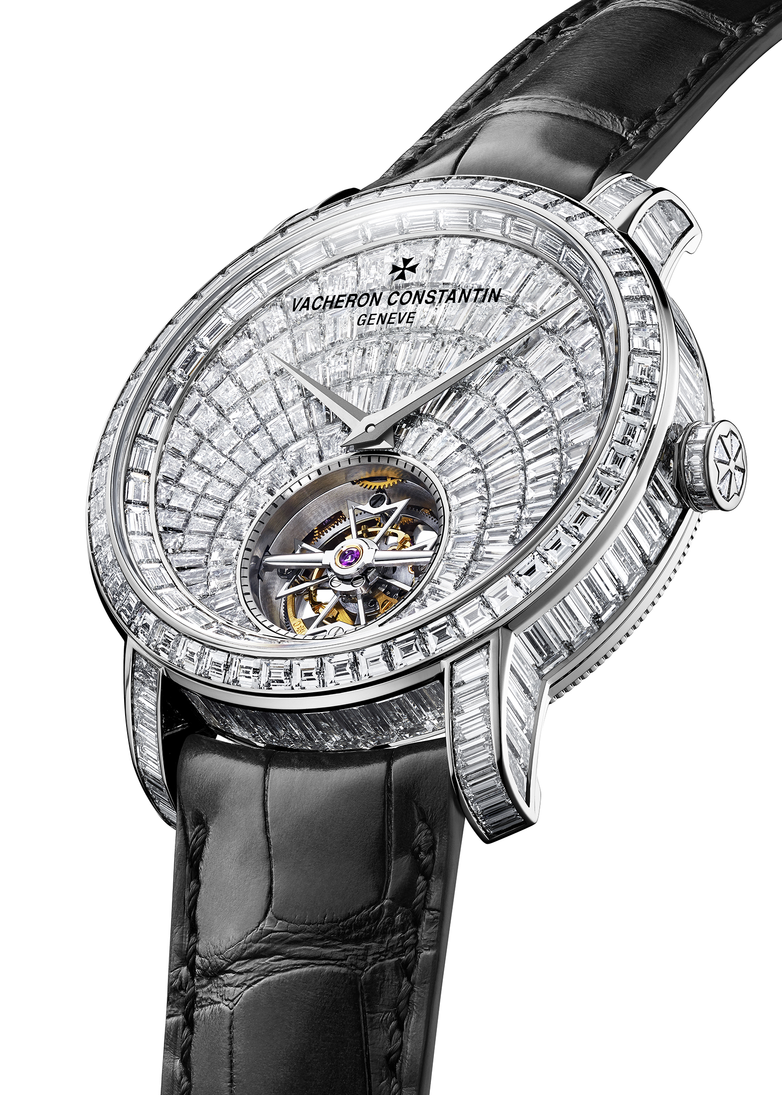 Vacheron Constantin has enhanced the Traditionnelle collection with a tourbillon High Jewellery model powered by ultra-thin Calibre 2160. This technical timepiece is enhanced by exceptional mastery in the art of invisible gemsetting. All case components are paved with baguette-cut diamonds, from lugs to caseband, from bezel to clasp and from the crown to the dial with its radiant motif. This Traditionnelle tourbillon High Jewellery timepiece reflects Vacheron Constantin’s own approach to High watchmaking.
