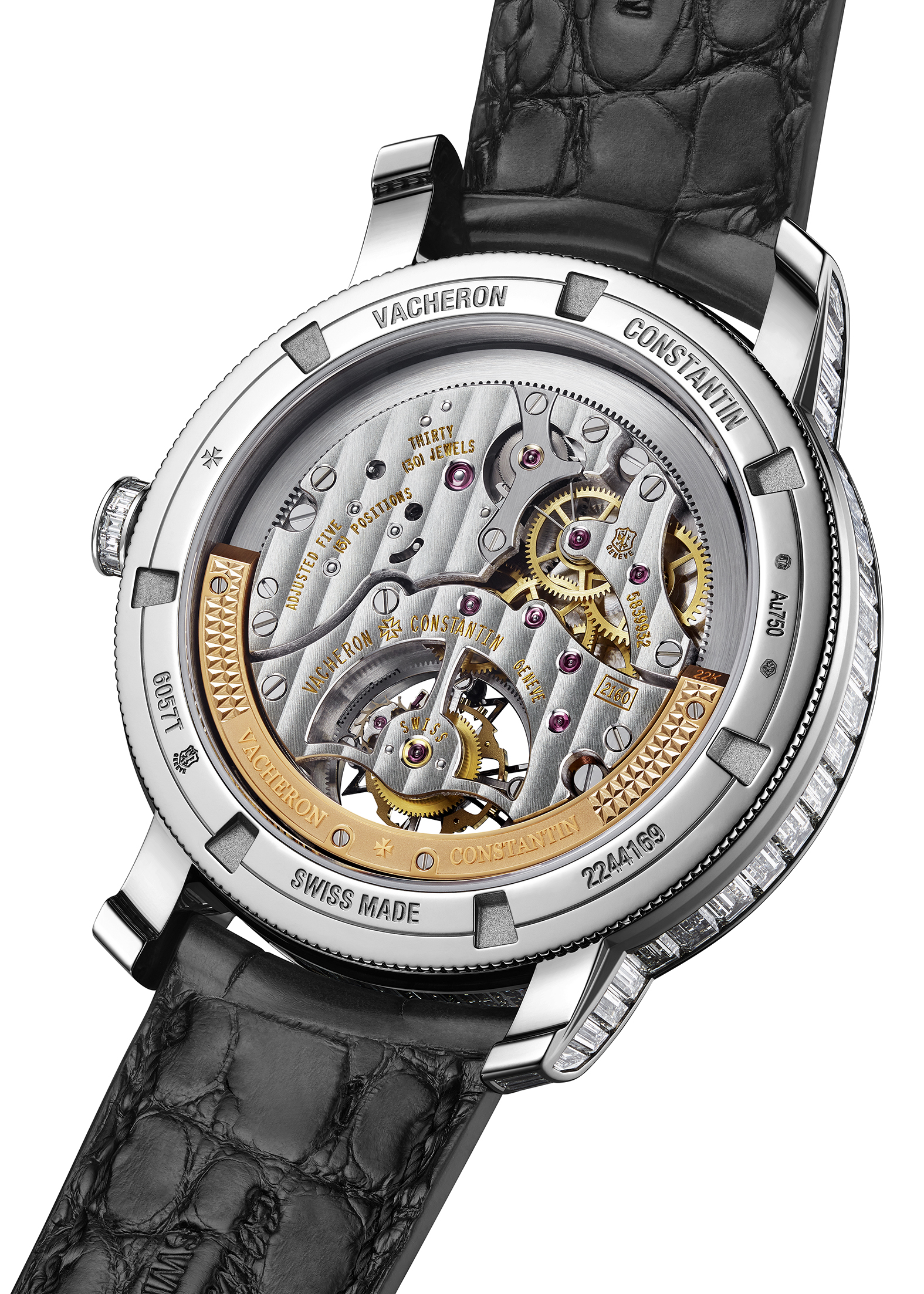The same quest for perfection has been applied to the finishing of the movement, with a circular-grained mainplate on the dial side and hand-bevelled bridges adorned with Côtes de Genève on the back. The gear train wheels are circular satin-finished, while the screws are chamfered and polished. Inspired by the Maison’s emblem, the tourbillon with its carriage bearing the small seconds indicated by a blackened screw features exceptional finishing lavished on all its components. One example is rounding off, which consists in filing the tourbillon bar to achieve a conical and semi-cylindrical shape, entirely hand-crafted to meet the criteria required by Vacheron Constantin.