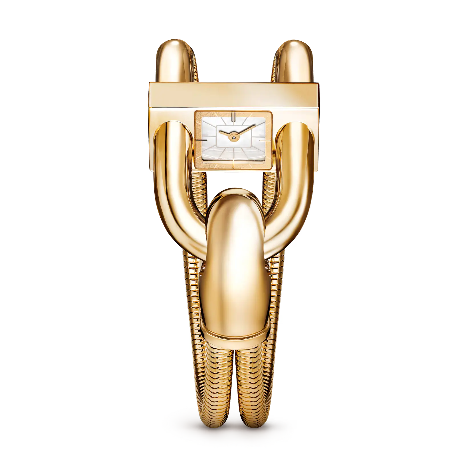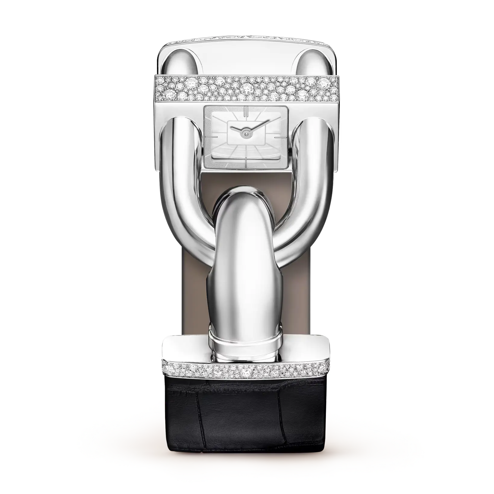 Cadenas — First created in 1935, this padlock-shaped design returns in yellow gold, snow-set diamonds, and sapphire accents. Its discreet, slanted dial remains a hallmark for those who prefer to keep their time private.