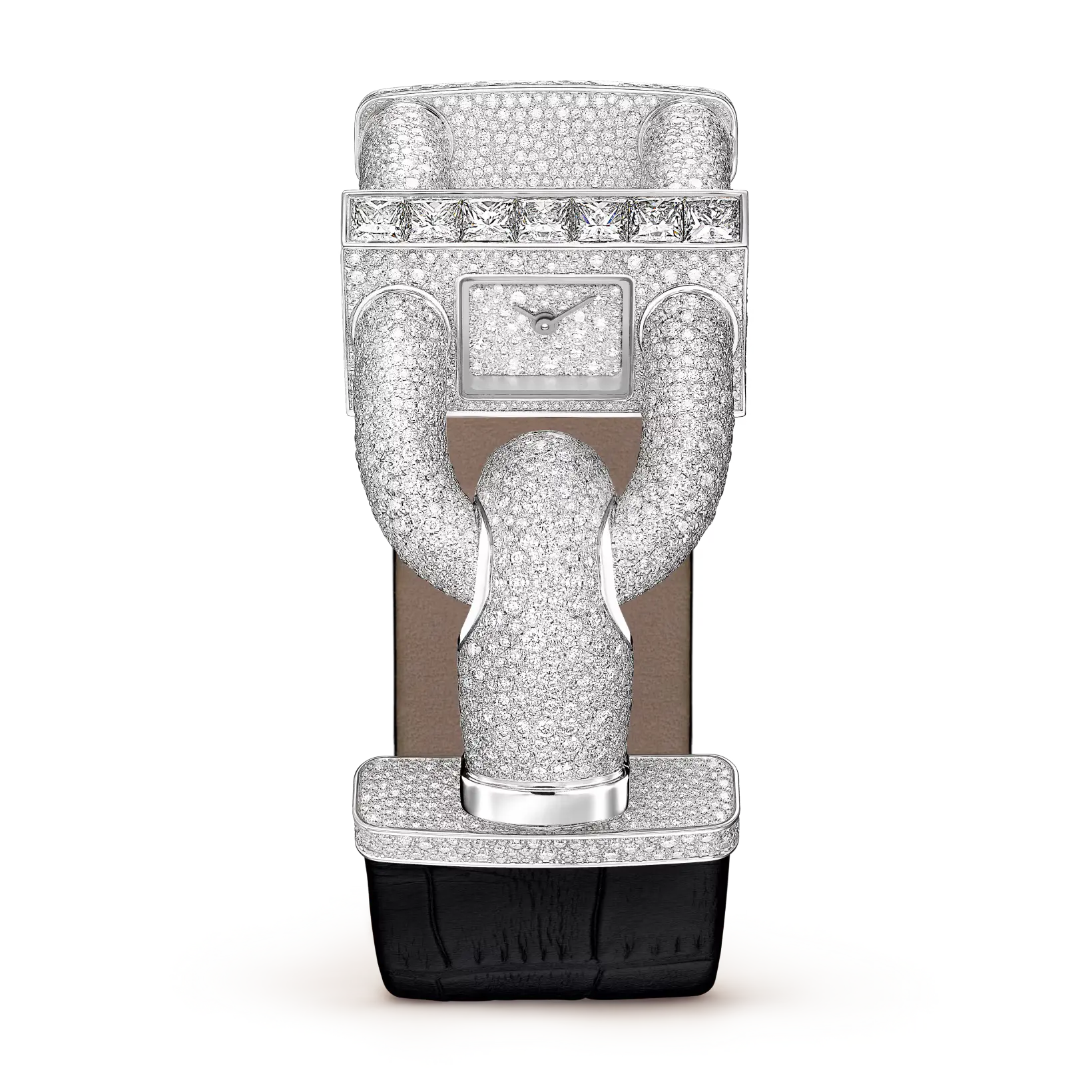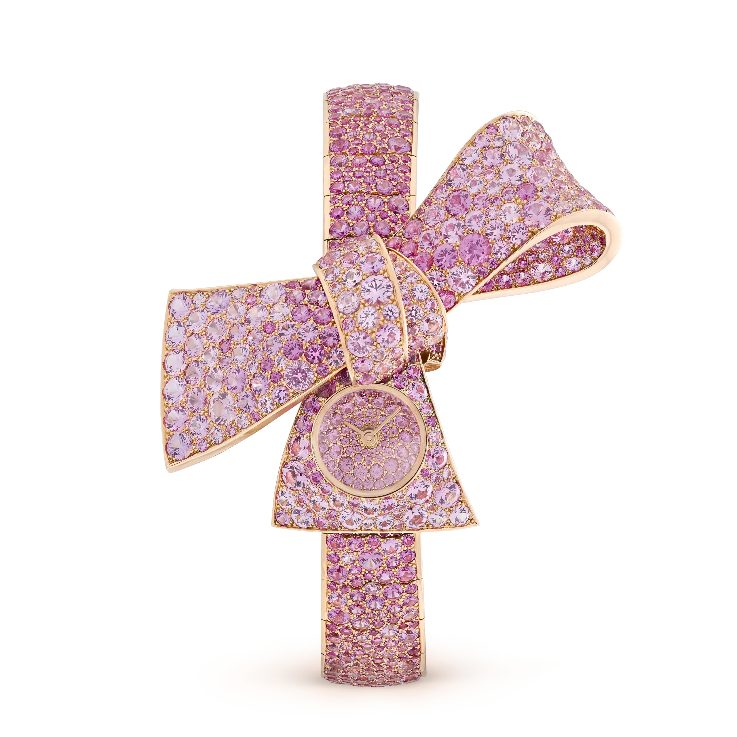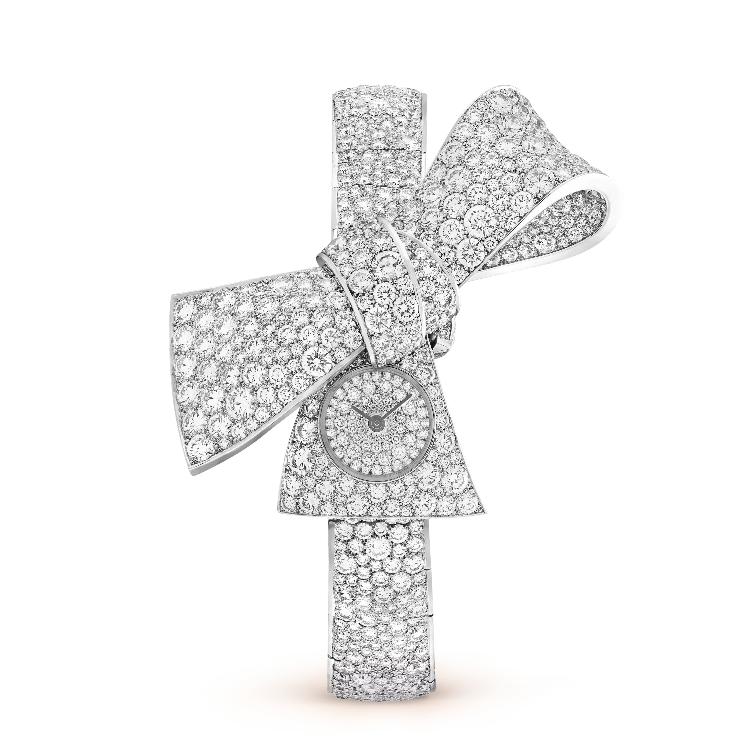 Ruban Mystérieux — A flowing ribbon of gems, hiding a mystery-set dial beneath a 3.72-carat diamond. It’s jewellery first, watch second — yet both at once.