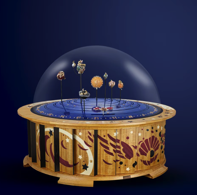 Planétarium Automaton — A miniature solar system in motion, with all eight planets orbiting a radiant sun at their true speeds. A shooting star marks the passing time while music underscores the celestial choreography.