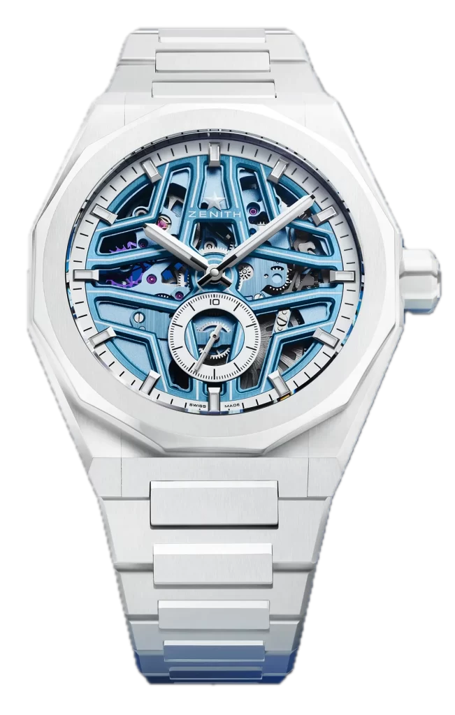 Visible through this openworked dial, as well as the sapphire display back, is the skeletonised automatic high-frequency El Primero 3620 SK caliber. In another important premiere, the caliber has been rendered to match the star-shaped bridges, offering the wearer a seamless light blue tone to the dial.
