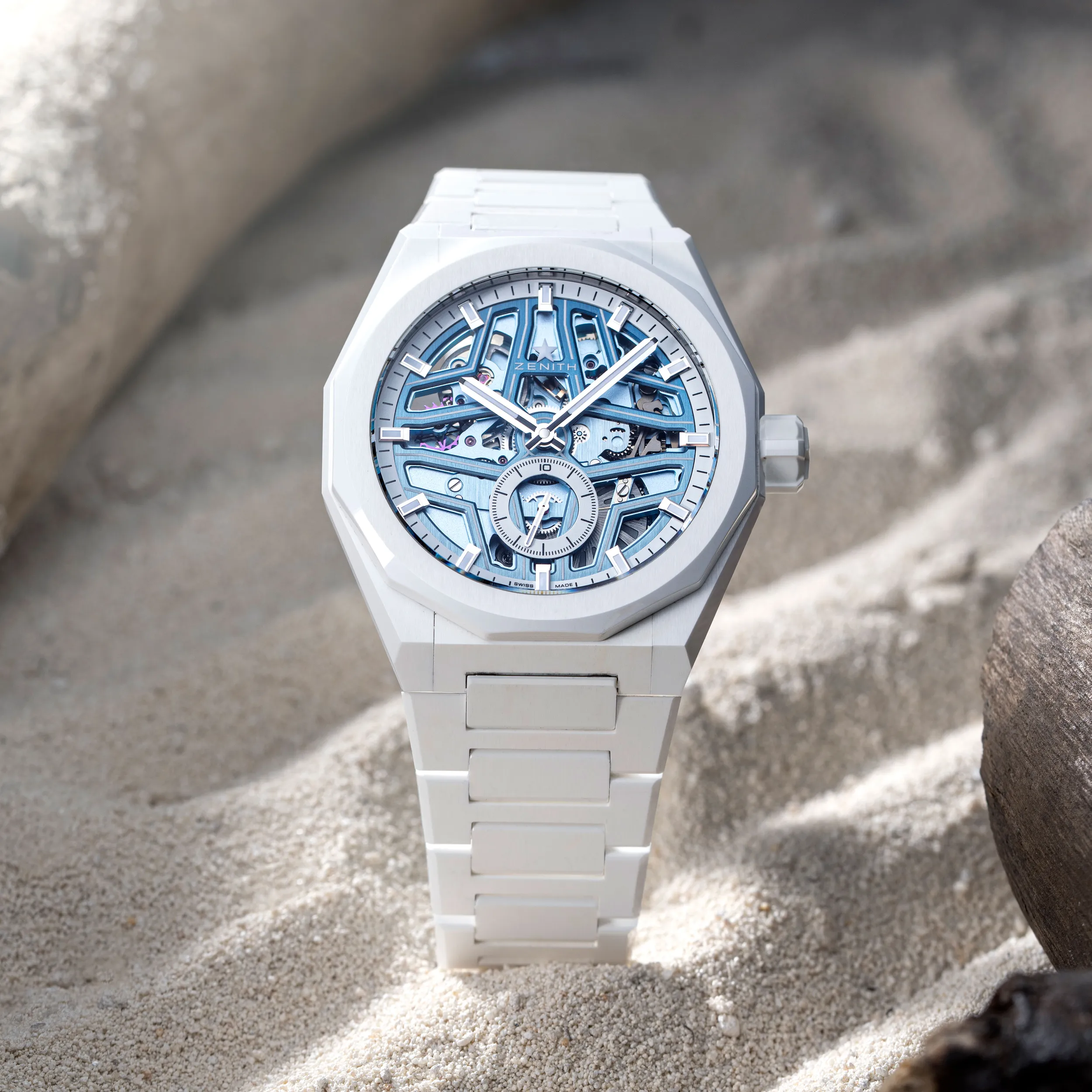 Perfectly complementing the white ceramic case and integrated ceramic bracelet is its gradient blue open dial and skeletonised movement. Continuing from the first two ZENITH x Time+Tide collaborations’ concept, the open dial fades from darker blue at the top to a breezy light blue at the bottom. The bridges of the dial adopt the form of ZENITH’s five-pointed star which is comprised of Super-LumiNova to enhance visual impact at night. This is a return to a design feature from the original DEFY Classic Skeleton Night Surfer – the only other time in its history that ZENITH has offered a luminescent star