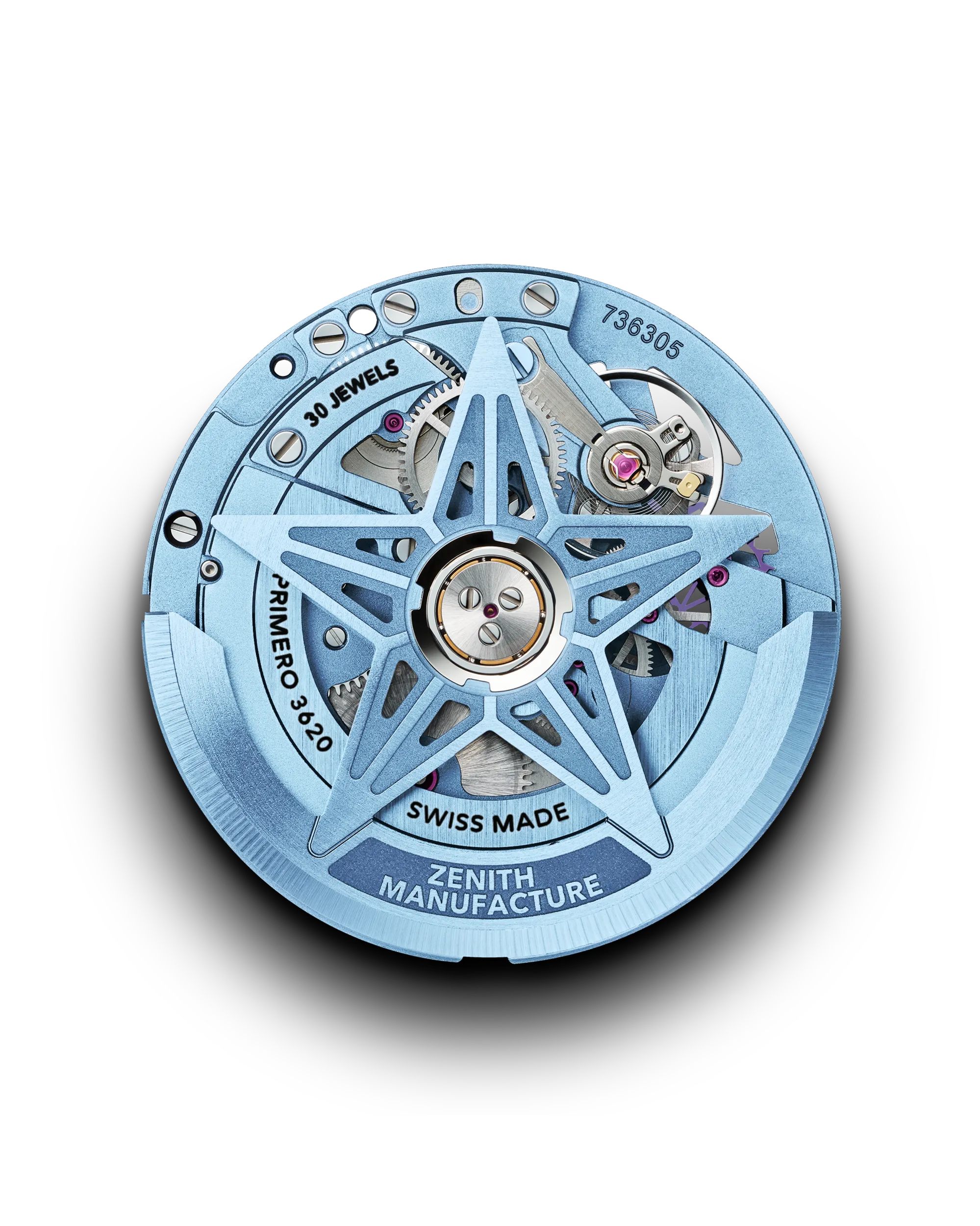 Derived from the iconic ZENITH high-frequency El Primero chronograph movement, it displays the hours and minutes while its 1/10th of a second hand is driven directly from the escapement, which beats at 5Hz (36’000 VpH). Its ‘hacking seconds’ mechanism allows for precise time-setting. The bi directional automatic winding mechanism delivers a power reserve of approximately 55 hours. In keeping with the watch’s theme, its mainplate, bridges and star-shaped rotor are rendered in a striking blue finish.