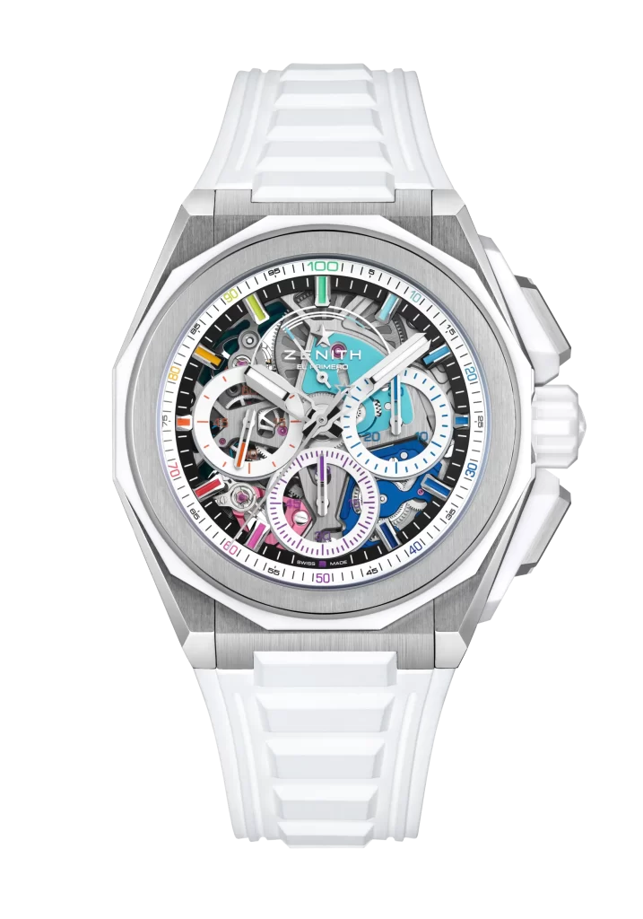 The two ZENITH DEFY Extreme Chroma editions combine titanium and ceramic, accentuated by a distinctive spectrum of colours. Their angular 45mm case comes either in microblasted titanium or in brushed and polished titanium, while the dodecagonal bezel, pusher protectors and crown are crafted in black micro-blasted titanium or white ceramic. The interplay of materials and finishes accentuates the DEFY Extreme’s architectural geometry, reinforcing its bold and dynamic character. Engineered for performance, it offers water resistance up to 20 ATM, making it ready for the most demanding conditions.