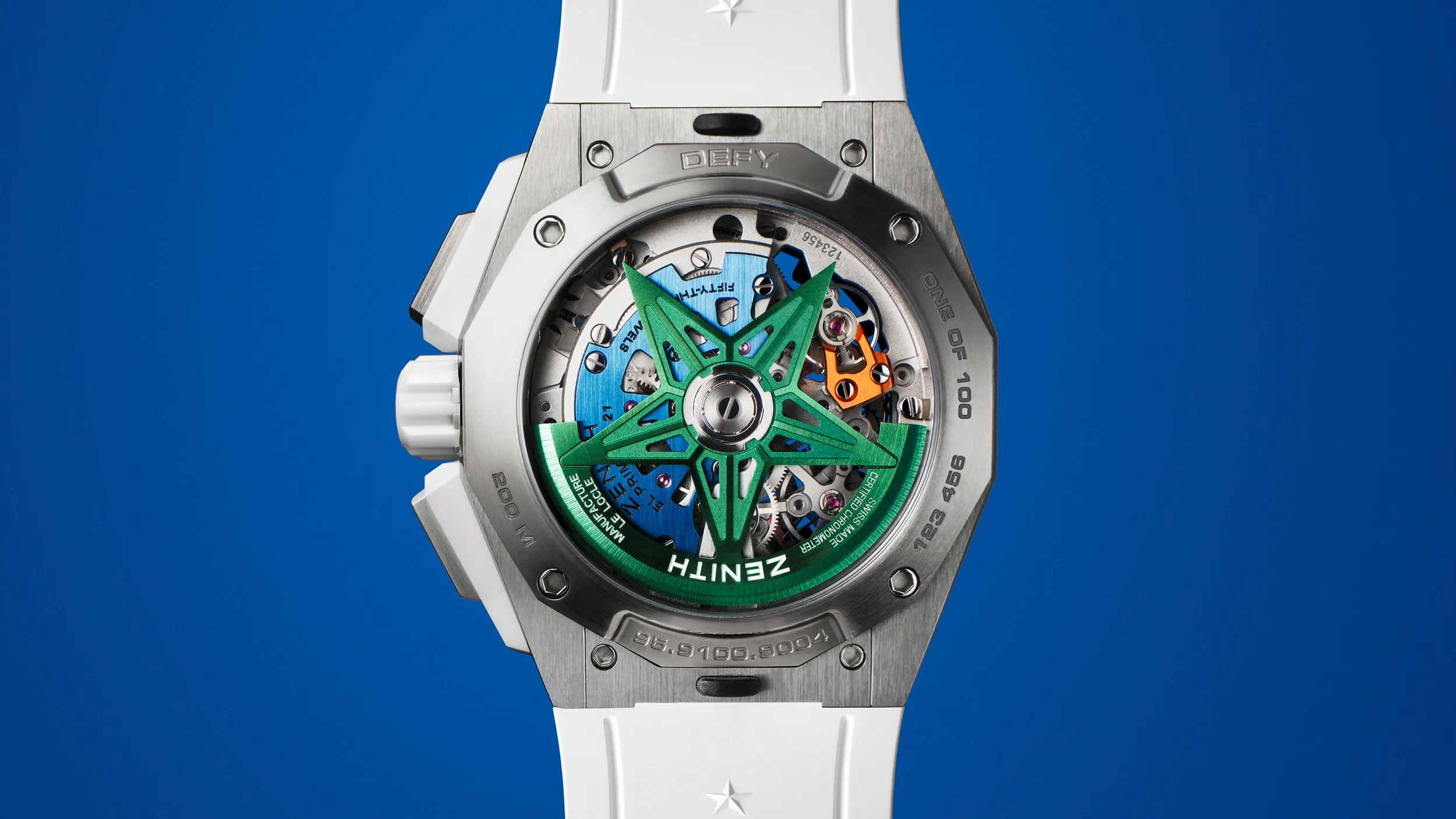 Inside the DEFY Extreme Chroma beats a unique version of the automatic El Primero 9004 calibre, whose bridges are PVD-coated in a spectrum of colours. This mechanical rainbow is partially revealed through the openworked black or white dial, where the markers and printings mirror the movement’s chromatic palette in a seamless gradient. Each movement displays its own distinctive colour composition. This vivid spectrum also extends to the tips of the subsidiary dial hands – for the chronograph hours and minutes at 9 and 3 o’clock, the chronograph power reserve at 12 o’clock, and the small seconds at 6 o’clock. On the reverse side, the polychrome theme continues with ZENITH’s signature star-shaped rotor, rendered in a striking blue hue for the black edition and electric green for the white edition.