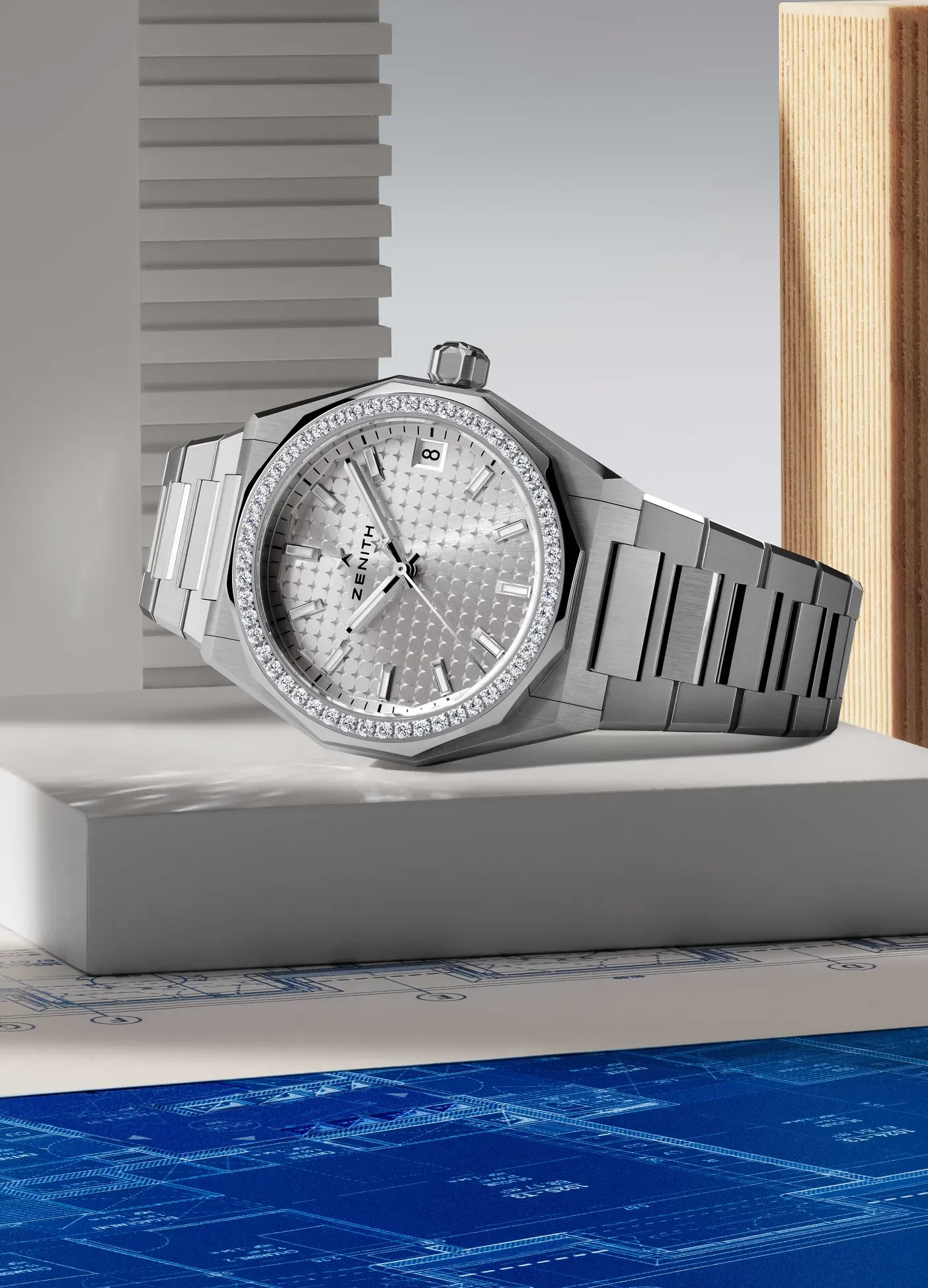 a diamond-set dodecagonal bezel (52 diamonds, 1 carat) that elevates the watch into a more jewellery-forward territory while remaining unmistakably DEFY