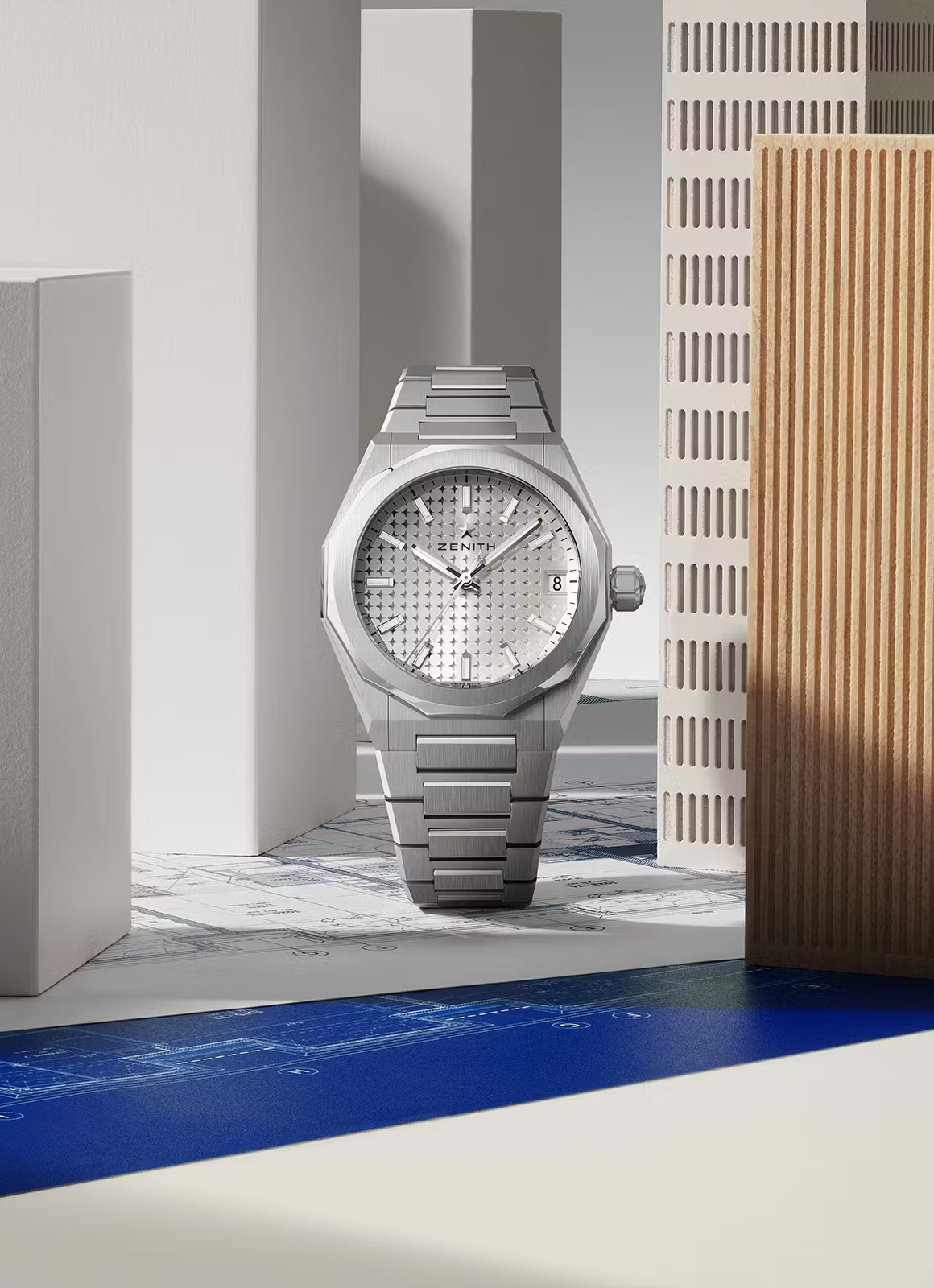A silver dial with applied indices and Super-LumiNova® ensures clarity, while the integrated steel bracelet—with a modern micro-adjustment clasp—adds contemporary comfort. Powering the watch is the Elite 670, a calibre that represents a milestone in ZENITH’s manufacture history: precise, slim, and engineered for long-term reliability.