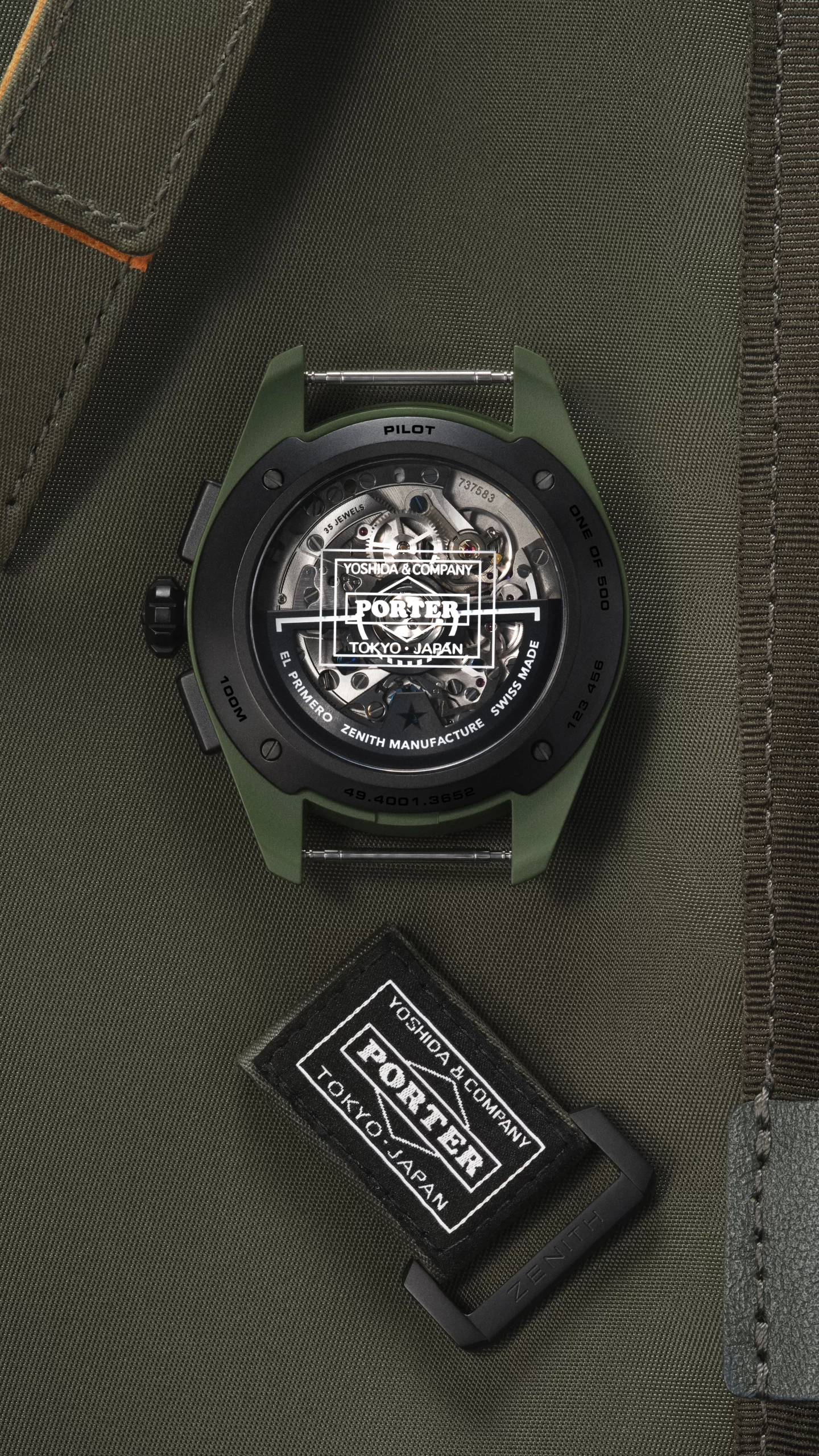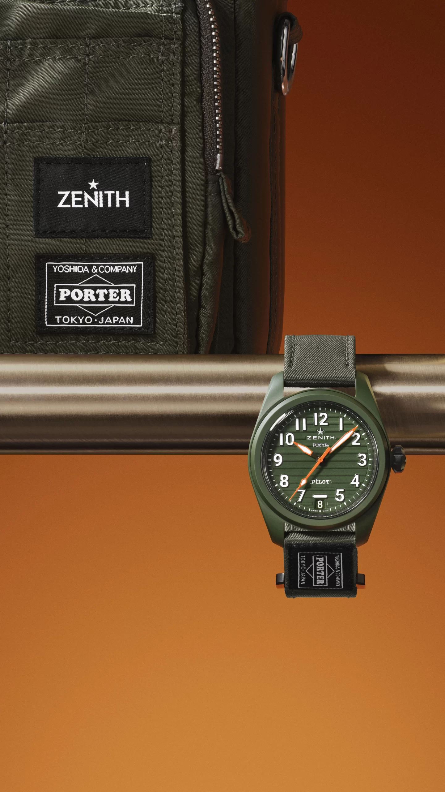 ZENITH and iconic Japanese bag brand PORTER have come together for an unexpected yet totally coherent collaboration around the theme of travel. Together, the pair have reimagined two ZENITH PILOT models in khaki ceramic, along with a specially tailored bag made by PORTER exclusively for ZENITH: The PILOT Automatic and PILOT Big Date Flyback chronograph, each limited to 500 pieces.